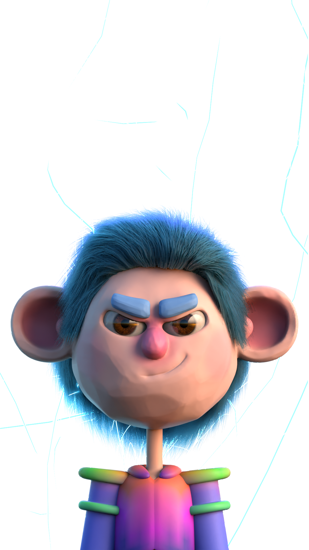 Colorful 3D character design with blue spiky hair and vibrant clothing on clean background.